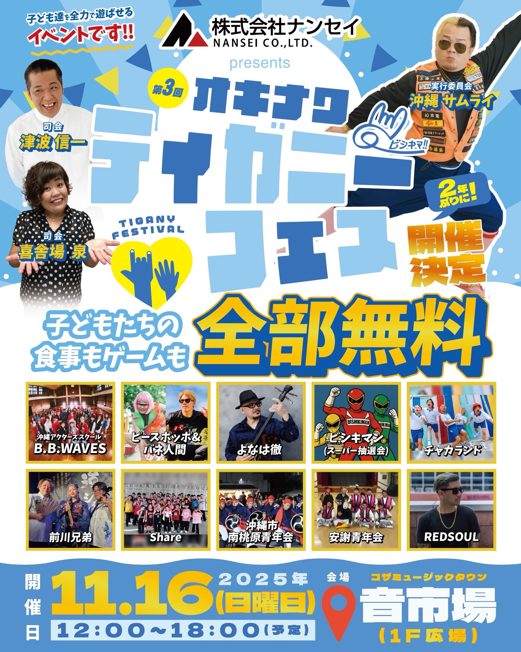 2025.11.16(日)コザミュージックタウン音市場1Fにて開催される「ティガニーフェス」にB.B.WAVESの出演が決定しました!子供たちの食事やゲームも無料で全て無料のイベントです!是非ご家族揃って遊びにきてください!📍日時:2025年11月16日(日)📍場所: コザミュージックタウン音市場1F広場#ティガニーフェス#コザミュージックタウン音市場