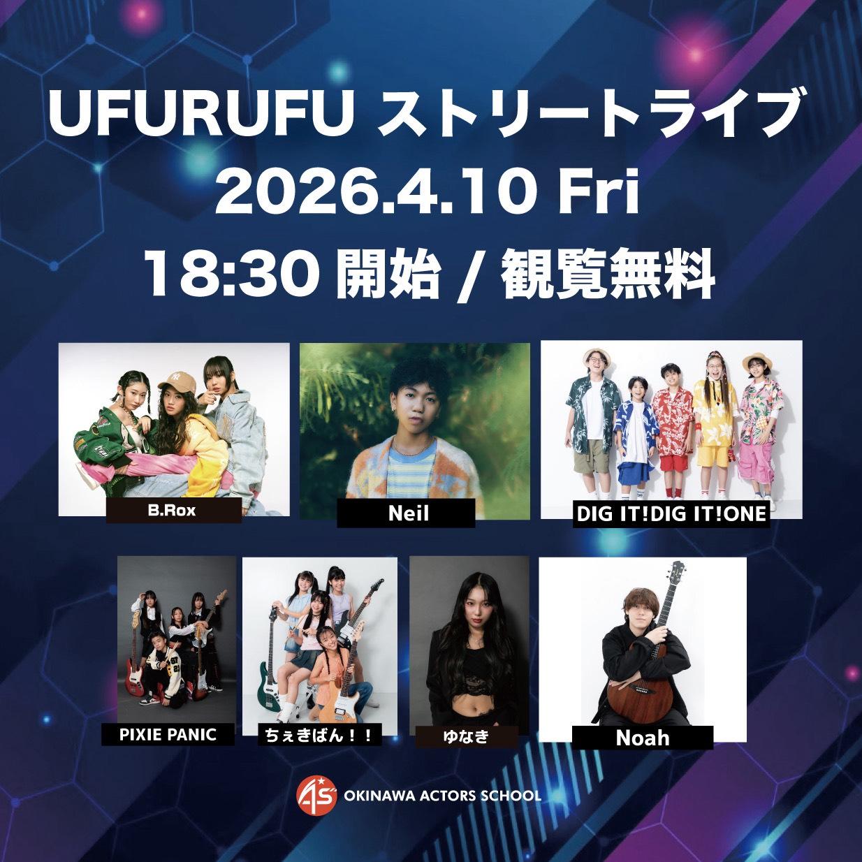 【UFURUFUストリートライブ情報】♦日程4月10日(金)18:30-♦場所パレットくもじ UFURUFU※観覧無料(雨天中止)♦出演・B.Rox・Neil・DIG IT! DIG IT! ONE・PIXIE PANIC・ちぇきばん!!・ゆなき・Noah
